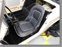 Les sièges reçoivent de nouvelles mousses, puis sont regarnis en simili noir, avec un passepoil beige assorti à la couleur de la carrosserie, plus élégant qu'un passepoil blanc standard.