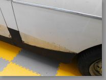 Sur toute la longueur du véhicule, le bas de caisse est perforé. Le retour de l'aile arrière ne vaut pas mieux. Quant au passage de roue avant, ce n'est plus qu'un souvenir...tout comme le bas du montant de porte qui est de plus généreusement rempli de mastic.