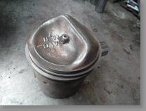 Nous apercevons à présent les pistons, très calaminés eux aussi. Les cylindres sont très peu usés, et de manière en apparence régulière. La métrologie nous montre que l'usure est effectivement négligeable, et qu'aucune ovalisation n'est à déplorer. Nous pratiquerons don un "simple" déglaçage, et les segments seront neufs évidemment. Notons que sur l'un des deux pistons, le tierçage des segments a apparemment été "oublié" !
