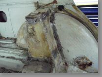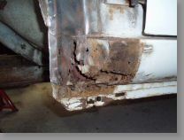 Détail de l'extrémité avant du bas de caisse: la corrosion perforante qui a rongé les bas d'ailes a ici fait son oeuvre également.